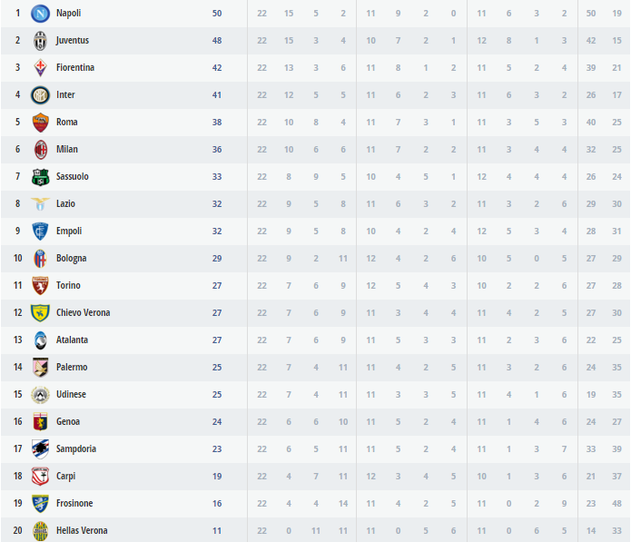 Il Napoli batte l’Empoli 5-1 e ritorna primo in classifica a +2 sulla Juventus. L’Inter, nel posticipo serale, cade nel derby milanese: i rossoneri vincono 3-0 con reti di Alex al 35′, Bacca al 73′ e Niang al 77′. Al 70′ – sull’uno a zero – pesa il rigore sbagliato da Mauro Icardi.