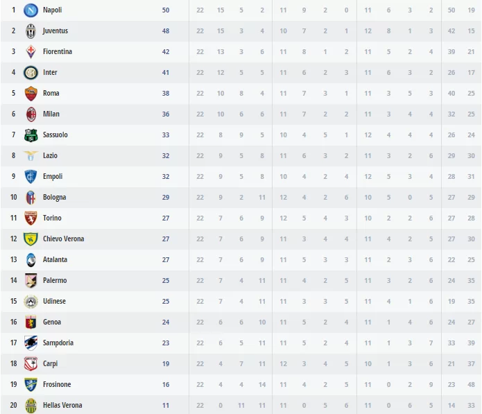 Il Napoli batte l’Empoli 5-1 e ritorna primo in classifica a +2 sulla Juventus. L’Inter, nel posticipo serale, cade nel derby milanese: i rossoneri vincono 3-0 con reti di Alex al 35′, Bacca al 73′ e Niang al 77′. Al 70′ – sull’uno a zero – pesa il rigore sbagliato da Mauro Icardi.