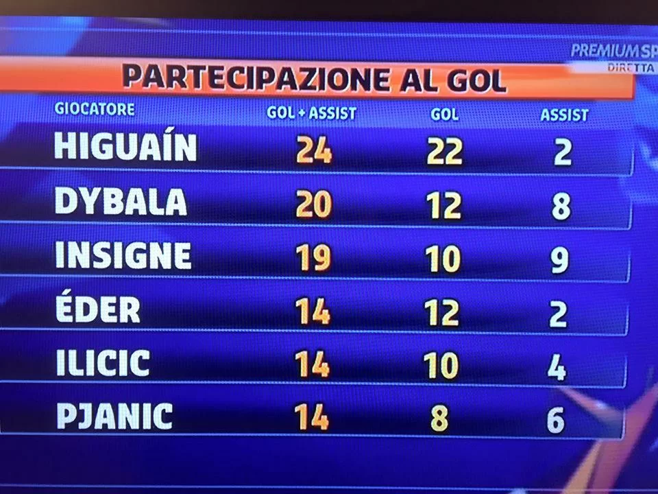 Re Mida. Ciò che toccano, diventa oro, scintillante, seguendo le orme del mitico sovrano della Frigia. A parlare sono i numeri, impreziositi dall’ultima prestazione contro l’Empoli. Persino più eloquenti delle strepitose giocate con cui deliziano i tifosi azzurri e l’intera platea calcistica tricolore. Veri e propri cannibali: dai loro piedi passano 44 dei 50 goal segnati in campionato, la chiave di volta, insieme ad una retroguardia registrata a dovere, della vetta partenopea. Ben 22 goal – in altrettante partite – e 2 assist per il Pipita, ad un passo dalla doppia doppia d’accezione cestistica il numero 24 partenopeo: 10 goal e 9 assist che scandiscono a chiare lettere l’annata migliore della, ancor breve, carriera del talento di Frattamaggiore. L’unico a reggere il passo è il bianconero Dybala (12 goal e 8 assist), seguono distanti nella graduatoria Eder, Ilicic e Pjanic, come dimostra il grafico di Premium Sport.