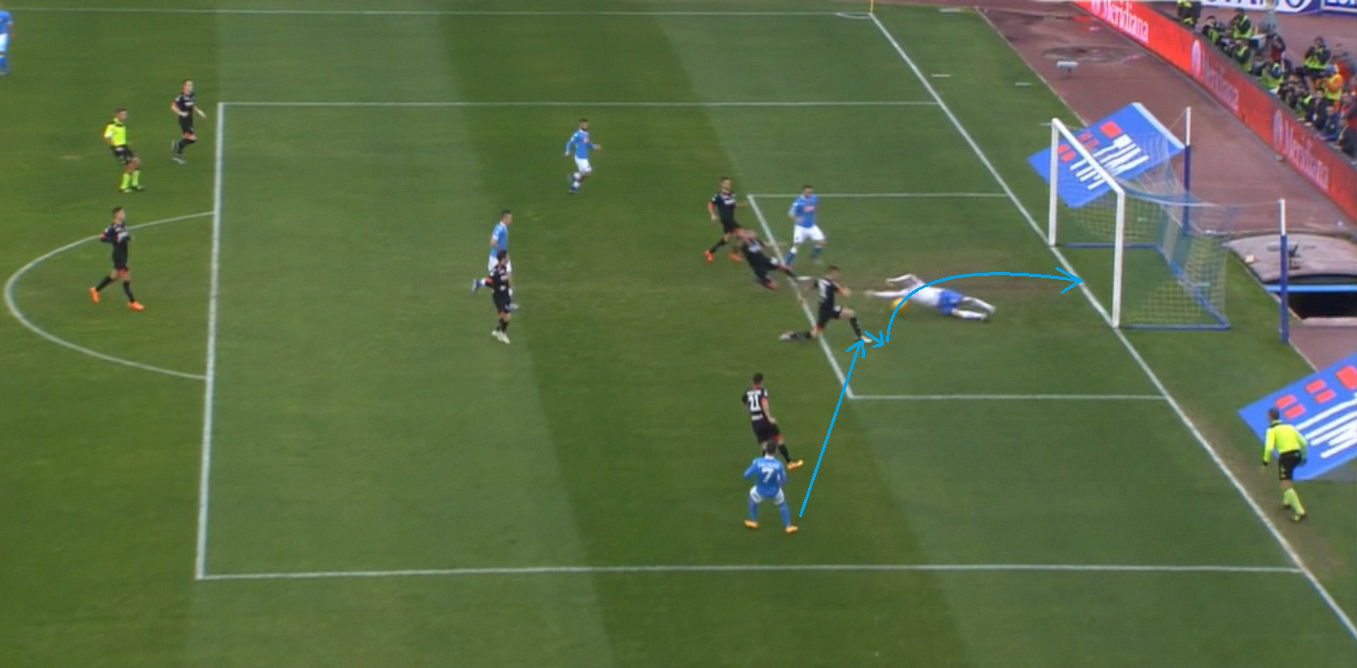 Insigne, dribblato l’avversario diretto, lascia partire un traversone al bacio per Higuain che svetta in area di rigore e porta il Napoli sull’1-1, sfruttando al massimo l’errore della coppia difensiva toscana: