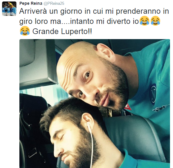 Pepe Reina colpisce ancora: questa volta la vittima è Sebastiano Luperto, immortalato in una foto dormiente nel treno durante il viaggio di ritorno a Napoli. “Arriverà un giorno in cui mi prenderanno in giro loro ma….intanto mi diverto io! Grande Luperto!”, ha scritto il portierone azzurro sul suo profilo Twitter. Con lo spagnolo non si dorme tranquilli.