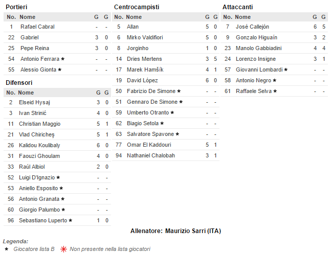 Attaccanti: 7 Callejon, 23 Gabbiadini, 9 Higuain, 24 Insigne, 14 Mertens.