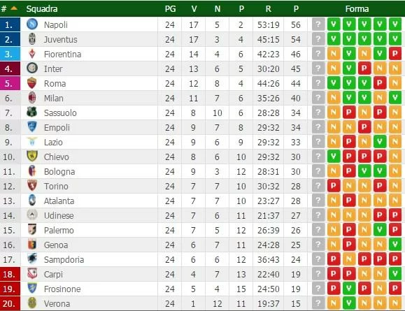 Ancora lontane Napoli e Juventus che hanno rispettivamente 12 e 10 punti di vantaggio.