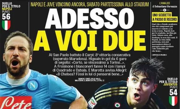 È la settimana che porta a Juventus-Napoli e sui quotidiani sportivi italiani ovviamente non si parla d’altro. Queste le prime prime pagine di questa mattina di Gazzetta dello Sport, Corriere dello Sport e Tuttosport.