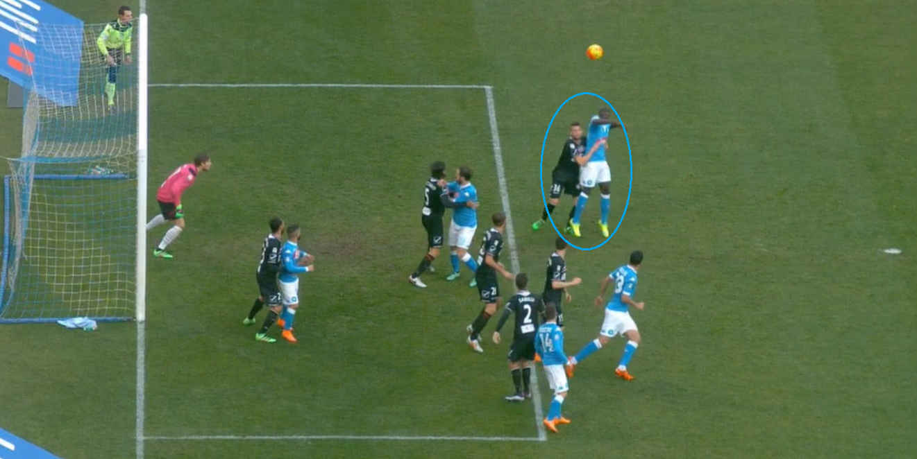 OCCASIONE PER GLI OSPITI – Come detto, tra le note negative della sfida contro il Carpi c’è sicuramente qualche errore difensivo di troppo. Sono state, sì, poche le occasioni per gli ospiti, ma ogni volta che gli emiliani superavano il centrocampo c’era la sensazione che qualcosa potesse succedere. Come al minuto 33′, quando dalla destra arriva un traversone che trova Lasagna in area di rigore. Per fortuna, il suo stacco finisce fuori. Due errori in particolare: 1) Ghoulam esce in modo lentissimo in chiusura su Letizia, dandogli così il tempo di crossare; 2) Hysaj non marca l’avversario tra porta e pallone ma si posiziona in marcatura a zona (e quando la sfera giunge in area non esiste marcatura a zona che tenga):