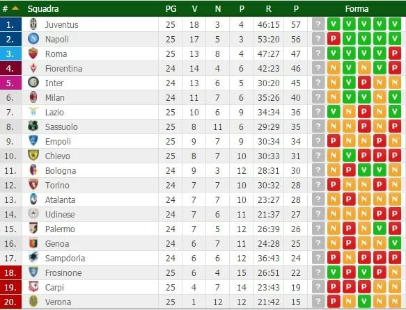 Il campionato di Serie A è arrivato alla giornata numero 25: il primo anticipo c’è stato giovedì sera con Lazio-Verona, con i biancocelesti che si sono imposti per 5-2. Ieri invece la Roma ha sbancato il Braglia di Modena sconfiggendo il Carpi per 1-3. Negli anticipi odierni alle 15 il Frosinone ha vinto una sfida fondamentale in chiave salvezza per 1-2 contro l’Empoli. Alle 18 è terminata per 1-1 la sfida tra Chievo e Sassuolo. Il big match delle 20.45 tra Juventus e Napoli si è invece concluso sul risultato di 1-0 per i bianconeri. Con questo risultato i bianconeri raggiungono la vetta della classifica.