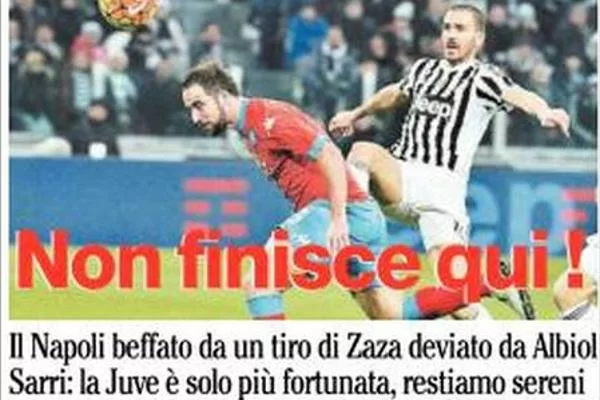 La Juventus ha battuto il Napoli per 1-0 grazie ad un gol di Simone Zaza nel finale, così strappando il primo posto della classifica di Serie A ai ragazzi di Maurizio Sarri. Ecco in che modo i tre maggiori quotidiani sportivi nazionali (Gazzetta dello Sport, Corriere dello Sport, Tuttosport) e Il Mattino hanno trattato l’argomento in prima pagina.