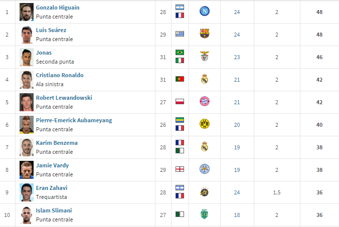 Gonzalo Higuain, a secco nell’ultima gara di campionato contro la Juventus, rimane ancora in testa alla classifica della Scarpa d’oro 2015-16 con 24 reti. Luis Suarez, attaccante del Barcellona, l’ha però raggiunto questa sera, dopo aver segnato nel match contro lo Sporting Gijon.