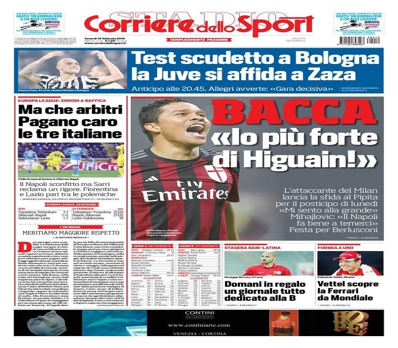 Ecco le prime pagine dei principali quotidiani. Si parte dalla Gazzetta con “Sveglia Italia!” e Bacca sul Corriere dello Sport che azzarda: “Io più forte di Higuain”. A seguire anche Marca, il Mattino e Tuttosport (SCORRI IN ALTO).