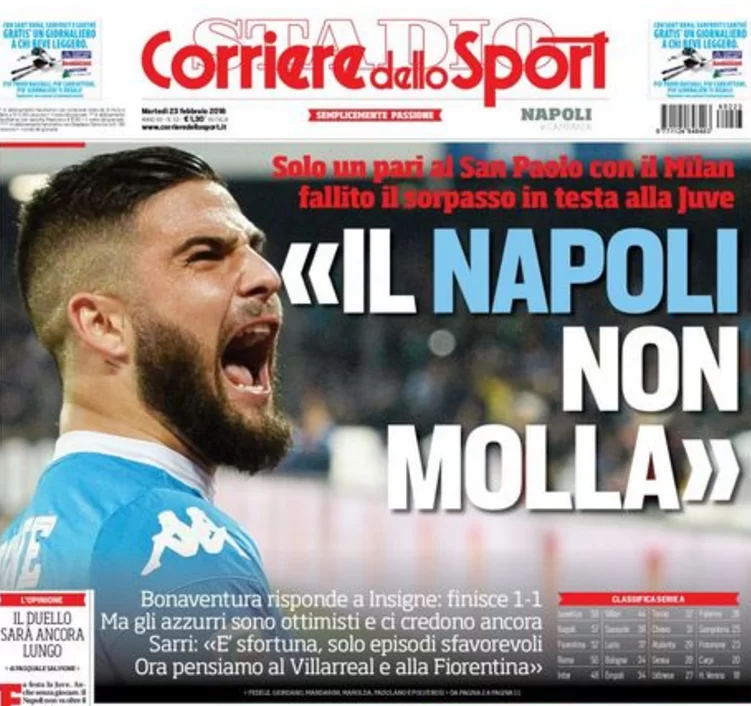 Ecco le prime pagine dei principali quotidiani. Si parte dalla Gazzetta dello Sport che esalta la prestazione di carattere del Milan e sottolinea il terzo stop consecutivo del Napoli, mentre il Corriere dello Sport titola: “il Napoli non molla”. A seguire anche Repubblica e Tuttosport.