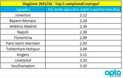 Si è sempre detto che i campionati si vincono con la miglior difesa. E il Napoli, sotto questo aspetto, è migliorato tantissimo rispetto alle passate stagioni. Secondo gli specialisti di statistiche di Opta, gli azzurri subiscono in media 2,38 tiri a partita. E in questa particolare classifica, sono quarti in Europa: al primo posto c’è la Juve, seguita dal Bayern Monaco e dall’Atletico Madrid.