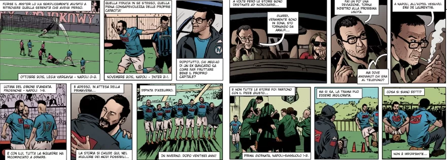 La storia di Maurizio Sarri e Gonzalo Higuain diventa un fumetto. L’iniziativa è della Scuola italiana Comix (con sede in via Atri), diretta da Mario Punzo, che l’ha realizzato in esclusiva per Repubblica. Due pagine che raccontano due vite apparentemente distanti: da una parte il tecnico toscano che decide improvvisamente di lasciare il suo posto fisso per dedicarsi al mestiere di allenatore, vincendo di fatto la sua scommessa. Dall’altra l’argentino che sta facendo sognare Napoli, dopo una stagione – la scorsa – fatta di luci e ombre. I due destini magicamente incrociati e raccontati attraverso questo innovativo fumetto.