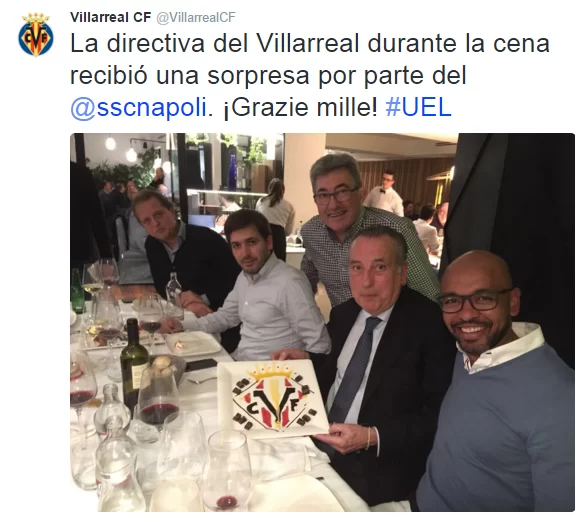 Rapporti sempre più buoni tra Napoli e Villarreal. Dopo il tradizionale pranzo pre partita la settimana scorsa in Spagna, questa sera la dirigenza valenzana ha ricevuto un regalo da quella partenopea. Ecco il tweet: