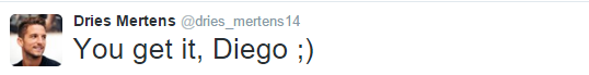 Dries Mertens, tramite il proprio profilo Twitter, ha risposto ai complimenti ricevuti da Diego Armando Maradona (“Mertens ha tutto: sa giocare, dribbling, fa gruppo, ha un buon tiro da lontano. Spero che Sarri lo impieghi di più).