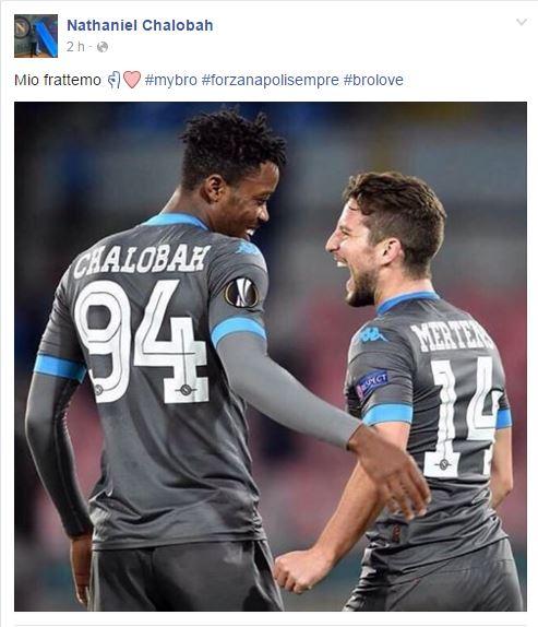 Il giovane calciatore azzurro Nathaniel Chalobah ha postato una foto sul suo profilo ufficiale Facebook dove ritrae se stesso in compagnia di Dries Mertens, definito dal calciatore inglese suo fratello.