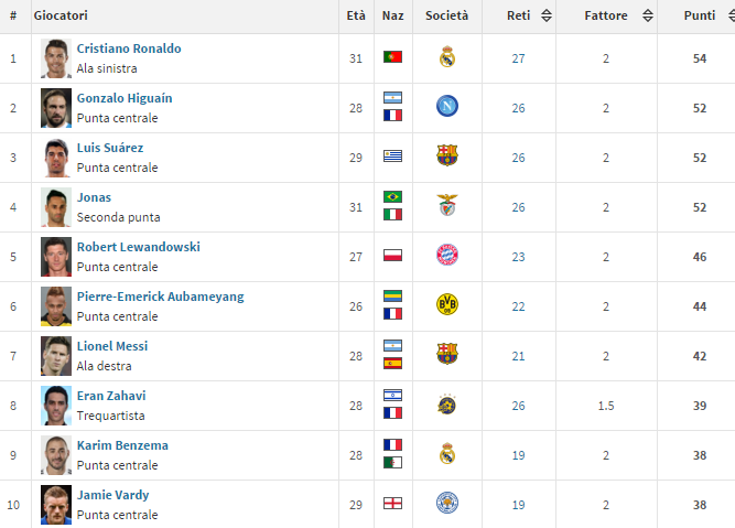 Continua l’accesa lotta alla conquista della Scarpa d’oro. Gonzalo Higuain, dopo la rete di ieri sera conto il Chievo, è secondo con 26 realizzazioni. L’argentino ha raggiunto Jonas del Benfica, ma è stato superato da Cristiano Ronaldo (27) grazie al poker contro il Rayo Vallecano. Oggi, invece, Luis Suarez ha agganciato il Pipita dopo aver segnato lo 0-4 ai danni dell’Eibar.