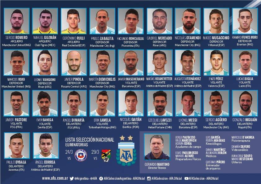 Anche il tecnico dell’Argentina Gerardo Martino ha già stilato la lista dei 29 giocatori che affronteranno il 24 e 29 marzo rispettivamente Cile e Bolivia. Tra questi figurano ben quattro ‘italiani’: c’è ovviamente Higuain, in uno stato di forma sensazionale, seguito da Dybala, Biglia e Roncaglia.
