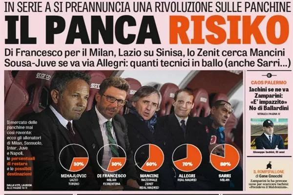 L’edizione odierna della Gazzetta dello Sport fa il punto sulle panchine più calde, in questo momento, del campionato italiano. L’unico certo della permanenza è Luciano Spalletti, le altre tremano. Su tutte quelle del Milan, dove l’avventura di Sinisa Mihajlovic sarebbe già arrivata al capolinea: Eusebio Di Francesco da Sassuolo sarebbe il candidato numero uno alla successione, senza dimenticare Roberto Donadoni e, ipotesi inimmaginabile, Maurizio Sarri.