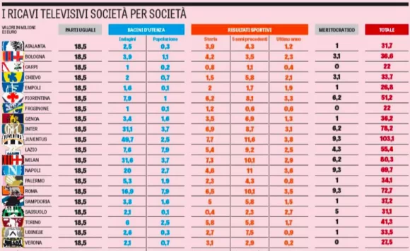 L’edizione odierna della Gazzetta dello Sport ha analizzato la situazione legata ai diritti televisivi della nostra Serie A e quanto guadagneranno i club al termine della stagione. 924,3 saranno i milioni netti che i club del nostro maggiore campionato dovranno spartirsi, in Lega si è deciso di seguire la vecchia ripartizione fino a quota 809 milioni, ovvero il montepremi netto della passata stagione: il restante 30% sarà suddiviso in base ai bacini d’utenza, col 25% stabilito dalle ricerche sul tifo e il 5% dai dati Istat sulla popolazione residente nel Comune in cui gioca la squadra; l’altro 30% sarà distribuito secondo i risultati, col 10% relativo alla storia sportiva (dal 1946-47), il 15% ai cinque anni precedenti e il 5% alla stagione in corso.