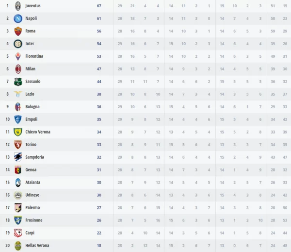 L’Inter vince in casa 2-1 contro il Bologna, supera momentaneamente la Fiorentina e si piazza al quarto posto a 54 punti, -7 dal Napoli. In rete Perisic, D’Ambrosio e Brienza.