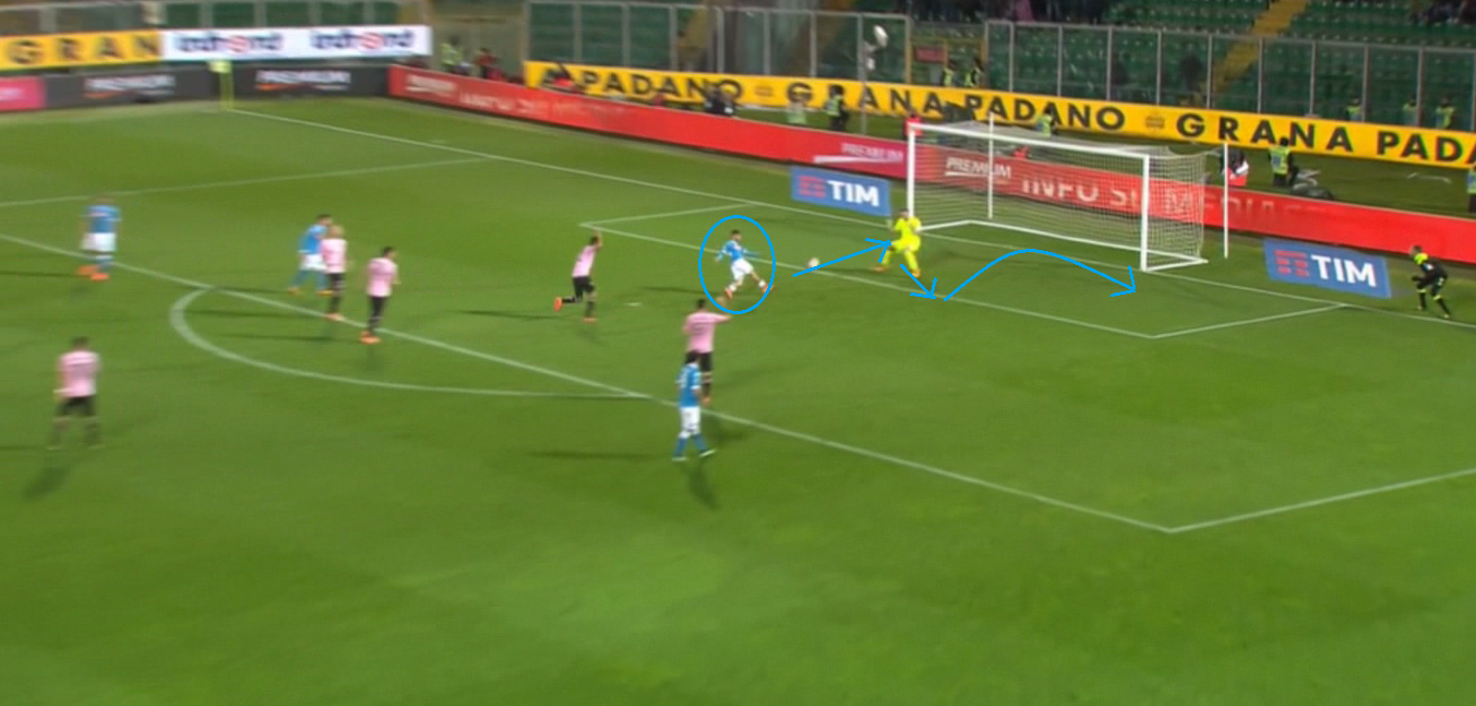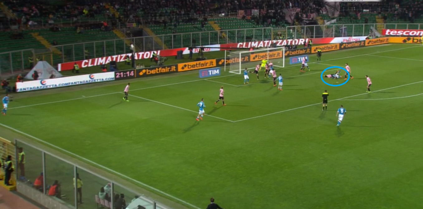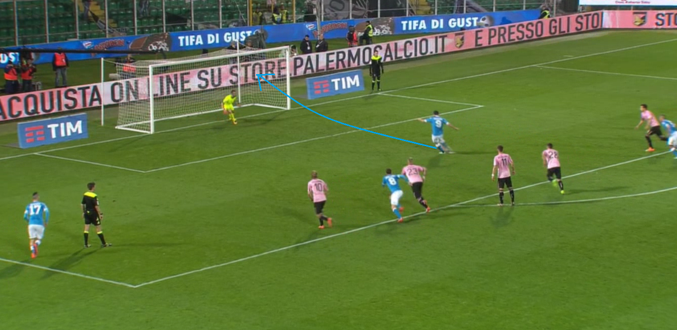AZIONE DA MANUALE DEL CALCIO – Ultima occasione per gli azzurri al 77′ minuto. L’azione è da manuale del calcio: semplice, ma allo stesso tempo efficace e incisiva. Manca solo il goal per coronare il tutto. Ma purtroppo il tiro di Mertens trova la buonissima risposta di Sorrentino. Anche in questo caso il Palermo tenta di annullare le linee di passaggio per i centrocampisti azzurri, lasciando palleggio libero ai due difensori centrali partenopei: