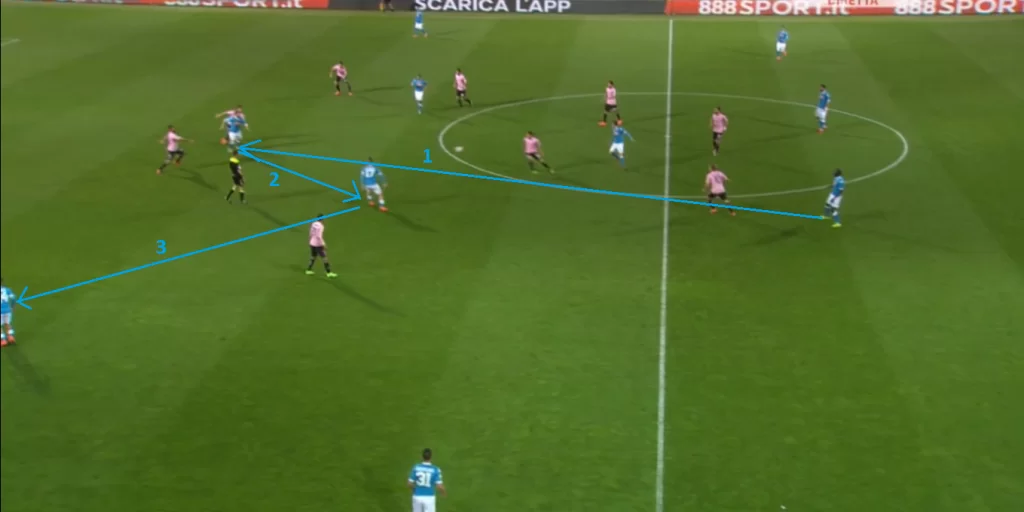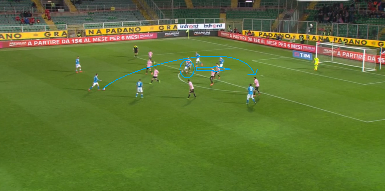 L’azione nasce da una improvvisa verticalizzazione di Koulibaly per Higuain. L’attaccante argentino scarica immediatamente per Hamsik, e quest’ultimo fa partite Lorenzo Insigne largo in fascia: