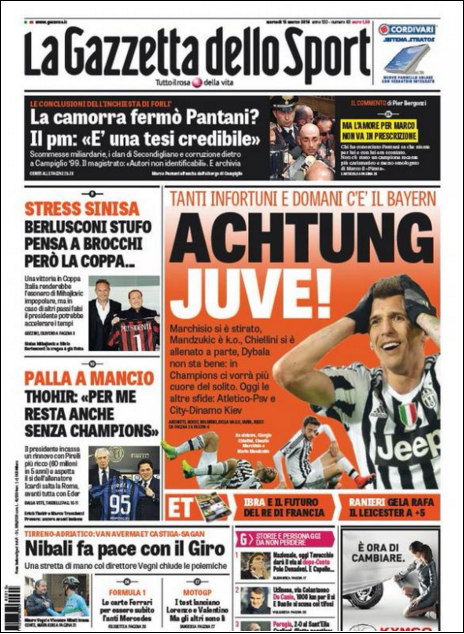 Ecco le prime pagine dei principali quotidiani. Si parte dal Corriere dello Sport (edizione Napoli e Campania), che al suo interno analizza la stagione da record del Napoli di Sarri, migliore anche di quella di Maradona. A seguire, sia la Gazzetta dello Sport che Tuttosport aprono invece con la Juventus in prima pagina in vista della trasferta di Monaco di Baviera, tra infortuni e interviste.
