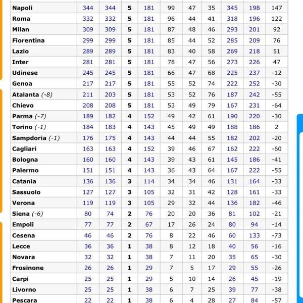 Il calcio è una materia che fa discutere, che appassiona milioni di tifosi e intorno al quale tutti possono avere una propria idea. Poi ci sono i numeri: infallibili, ineludibili, certi. E i numeri, nella tabella pubblicata su Facebook dal collega di Radio Marte, Massimo D’Alessandro, raccontano una verità sacrosanta.