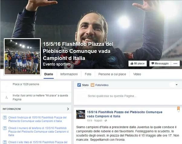 “Comunque vada campioni d’Italia – si legge sul gruppo – Siamo campioni d’Italia a prescindere dalla Juventus la quale conduce il campionato delle ruberie e dei favoritismi. Festeggiamo lo scudetto, lo scudetto degli onesti, in piazza del Plebiscito il 15 Maggio alle ore 17. Non mancate. Seppelliamoli con l’ironia“.