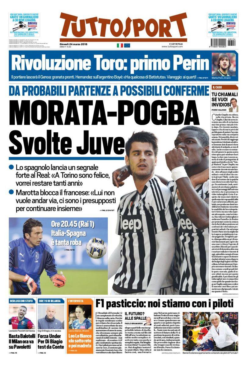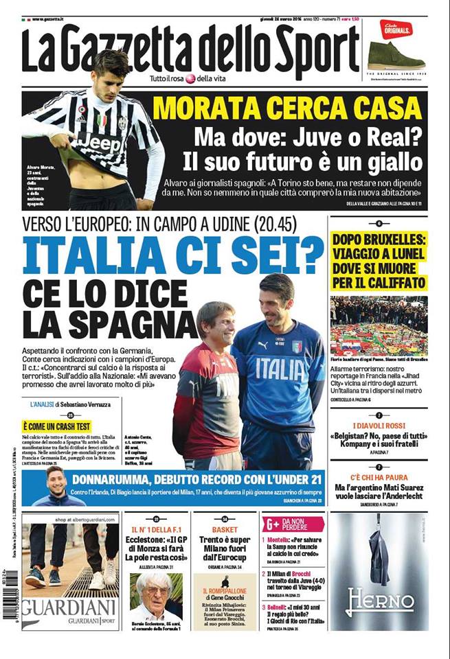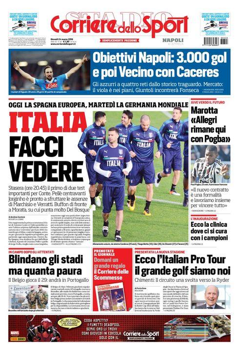 Le prime pagine dei maggiori quotidiani sportivi odierni si concentrano sulla Nazionale Italiana che questa sera affronterà la Spagna e sulla possibilità di giocare del centrocampista del Napoli Jorginho. Spazio anche per il mercato degli azzurri con Caceres e Vecino sugli scudi.