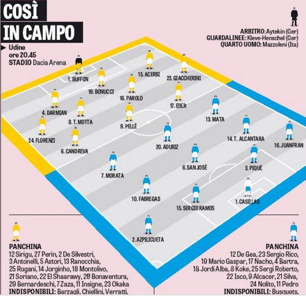 Lorenzo Insigne e Jorginho partiranno probabilmente dalla panchina nel match di stasera tra Italia e Spagna. Antonio Conte, infatti, sembra volersi affidare ad una mediana formata da Parolo e Thiago Motta. Panchina anche per El Shaarawy e Zaza. In avanti Eder e Candreva a sostegno della punta centrale Pellè.