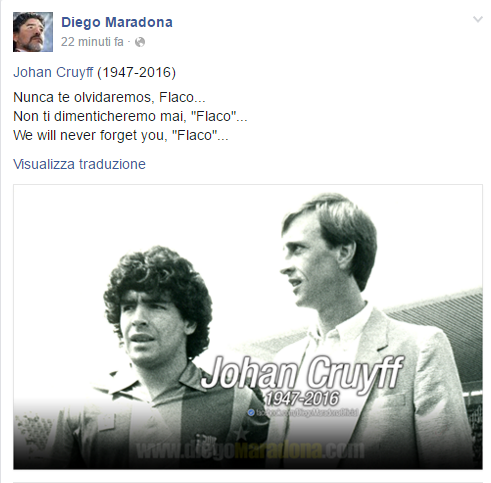 Ai tanti messaggi, si è aggiunto anche Diego Armando Maradona, grande amico del campione olandese. Diego ha voluto esprimere il suo dolore tramite la propria pagina ufficiale, con un messaggio toccante: “Non ti dimenticheremo mai, Flaco”.