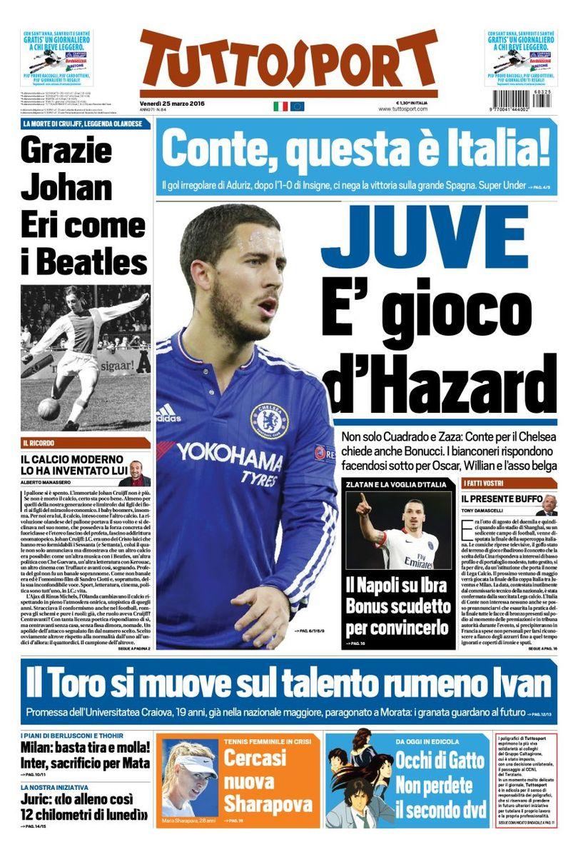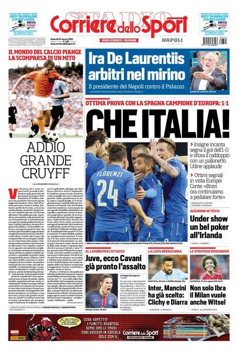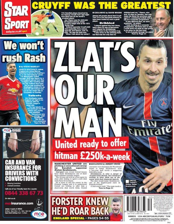 Le prime pagine dei quotidiani sportivi nazionali e internazionali aprono oggi con la situazione di Zlatan Ibrahimovic conteso dal Napoli e dal Manchester United; vengono evidenziate anche la grande prestazione della Nazionale Italiana e di Lorenzo Insigne contro la Spagna e le parole del presidente azzurro De Laurentiis contro il “Palazzo”.
