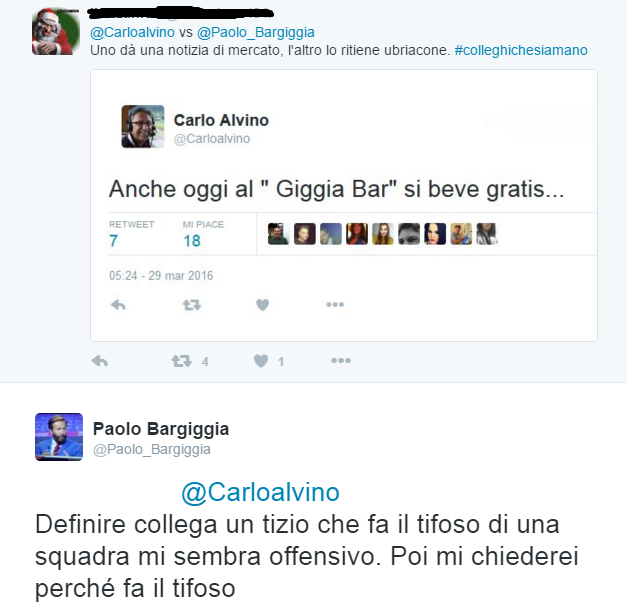 Bargiggia ha commentato, rispondendo ad un tweet di un altro utente: “Definire collega un tizio che fa il tifoso di una squadra mi sembra offensivo. Poi mi chiederei perché fa il tifoso”, ha scritto.