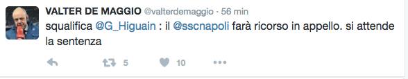 La notizia è stata riportata anche da Walter De Maggio sul proprio profilo Twitter, confermando la volontà della società azzurra di fare ricorso.