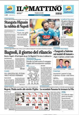 Ecco le prime pagine dei principali quotidiani in edicola quest’oggi. Tutti aprono con quello che sta diventando il ‘caso Higuain‘: la squalifica comminata al Pipita non va giu al Corriere dello Sport che titola “Ingiustizia Higuain”, difendendo l’attaccante del Napoli al suo interno. Stesso dicasi per Tuttosport, che considera troppo pesante la mano del giudice Tosel. La Gazzetta dello Sport, invece, punta tutto sulla furia della società partenopea e sul ricorso che verrà presentato per dimezzare le giornate di squalifica. Infine, anche Repubblica e Mattino affrontano l’argomento in prima pagina, scagliandosi contro la decisione del Giudice Sportivo.
