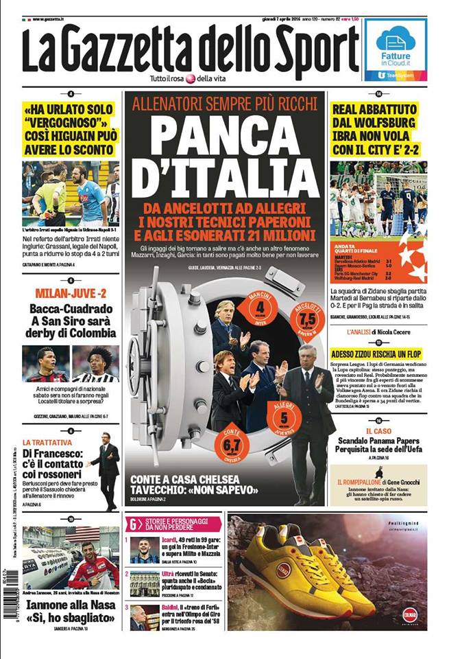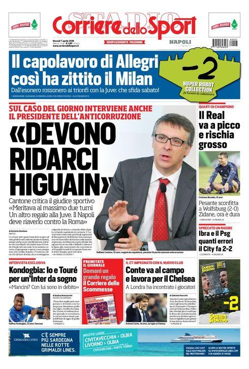 Sulle prime pagine dei quotidiani nazionali continua a tenere banco la questione relativa alla squalifica inflitta a Gonzalo Higuain, con particolari riferimenti al ricorso che farà il Napoli e alle motivazioni che porterà in tribunale. A intervenire sulla vicenda anche il Presidente dell’Anticorruzione Cantone.
