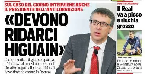 Sulle prime pagine dei quotidiani nazionali continua a tenere banco la questione relativa alla squalifica inflitta a Gonzalo Higuain, con particolari riferimenti al ricorso che farà il Napoli e alle motivazioni che porterà in tribunale. A intervenire sulla vicenda anche il Presidente dell’Anticorruzione Cantone.