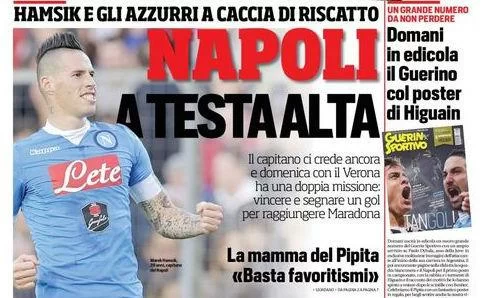 Sulle prime pagine dei quotidiani nazionali l’attenzione si mantiene sulla vicenda legata alla squalifica di Gonzalo Higuain, ma si cerca di trattare anche delle notizie del campo con Il Corriere dello Sport che si concentra sulla partita tra Napoli e Hellas Verona e Hamsik che con una rete potrebbe raggiungere Maradona. Il Mattino, invece, sottolinea il silenzio stampa imposto dal presidente De Laurentiis.