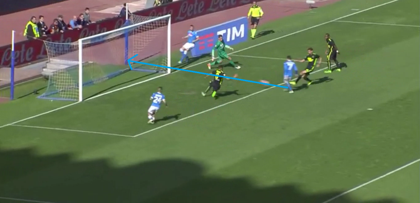Hamsik gioca palla (freccia azzurra) per Jorginho rimasto largo dopo il calcio d’angolo respinto dalla difesa veroneseIl regista italo-brasiliano riesce a trovare con un passaggio millimetrico (freccia azzurra) El Kaddouri (cerchio rosso) che attacca (freccia rossa) la profondità sfruttando il grande spazio concesso da Emanuelson e Samir (linea verde)El Kaddouri (cerchio giallo) aspetta il movimento di Callejon (freccia azzurra) prima di servirgli un pallone al bacio. Da evidenziare ancora una volta il comportamento confusionario della retroguardia ‘scaligera’: chi si dispone in diagonale positiva, chi marca a uomo: confusione totaleGOAL DEL NAPOLI – Callejon spinge dentro con estrema facilità