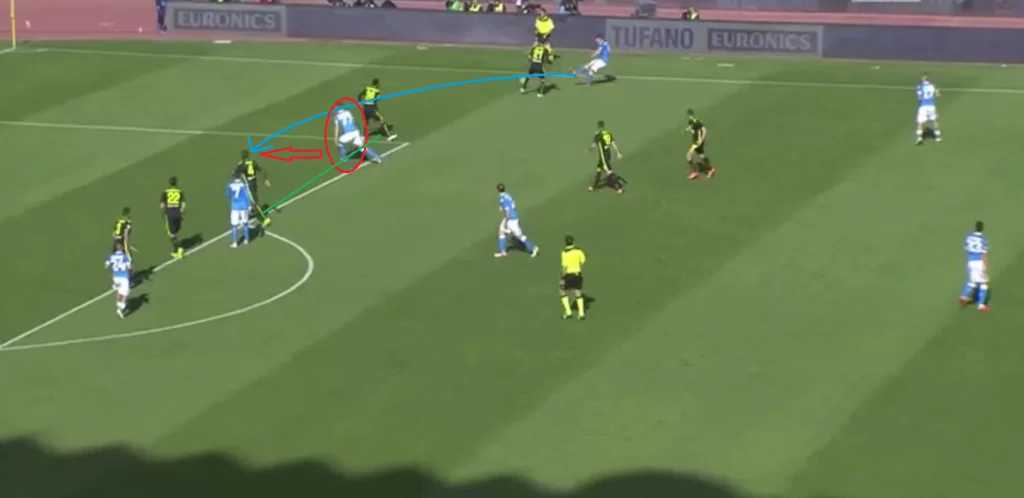 In situazione di non possesso, il Napoli si compatta in tutti e tre i reparti: la difesa (linee rosse) si dispone in linea piatta e si alza fin quasi a metà campo; il centrocampo (linee gialle) vede l’aggiunta di Callejon e Insigne, e una pressione solitaria di David Lopez (cerchio bianco)Su rilancio alto di Gollini, Chiriches (cerchio azzurro) esce in chiusura, e Albiol, Ghoulam e Hysaj si dispongono alle sue spalle (linee gialle) in modo da dare copertura e compattezzaHamsik (cerchio rosso) dribbla i suoi diretti avversari in grande stile, regalando anche un tunnel (freccia rossa) ai danni di VivianiHamsik (cerchio azzurro) verticalizza per Callejon (cerchio rosso) che attacca (freccia rossa) la difesa del Verona disposta malissimoGOAL DEL NAPOLI – Insigne trasforma (freccia azzurra) il calcio di rigore procurato dallo stesso Callejon e che porta al cartellino rosso di Souprayen