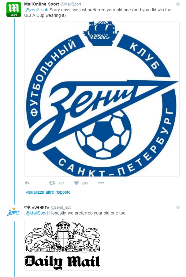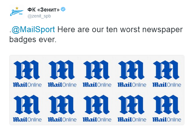 Singolare è inoltre la risposta dello Zenit San Pietroburgo, che non ha digerito la scelta del tabloid inglese di inserire anche il logo dei russi tra quelli sopracitati. Sul proprio profilo Twitter ufficiale infatti hanno pubblicato un post che racchiude, secondo loro, i 10 stemmi più brutti dei giornali: ovviamente i posti sono tutti occupati dal logo del Daily Mail.