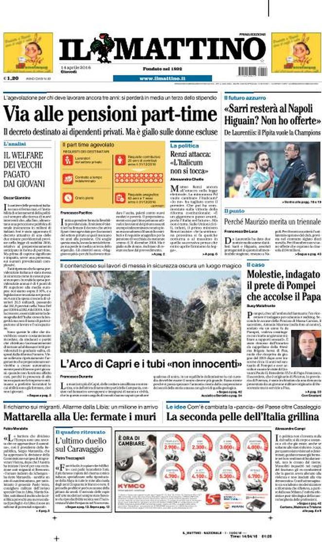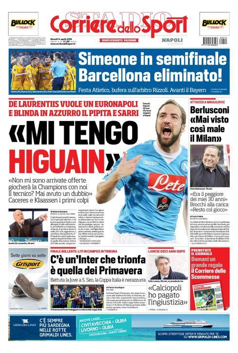 Le prime pagine dei quotidiani sportivi odierni si concentrano sulle parole del presidente del Napoli Aurelio De Laurentiis nel corso della conferenza stampa di ieri per la presentazione del ritiro di Dimaro 2016; in particolare vengono evidenziate le dichiarazioni riguardanti Maurizio Sarri e Gonzalo Higuain e il loro futuro che potrebbe essere ancora azzurro.