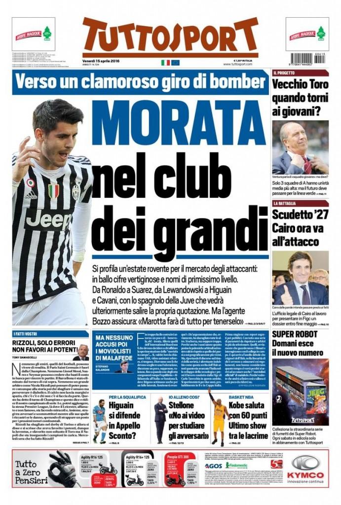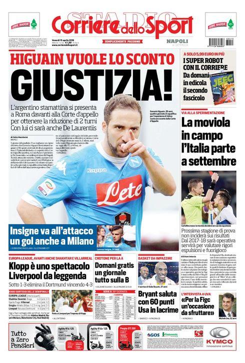 Le prime pagine odierne si concentrano molto sulla questione legata alla squalifica di Gonzalo Higuain, arrivata oggi ad un momento cruciale dato che il Pipita discuterà dinanzi la Corte d’Appello per cercare di ottenere una riduzione; con lui sarà presente in aula anche il presidente del Napoli Aurelio De Laurentiis. Tuttosport, invece, evidenzia un giro di attaccanti nel prossimo mercato che potrebbe coinvolgere lo stesso bomber argentino azzurro.