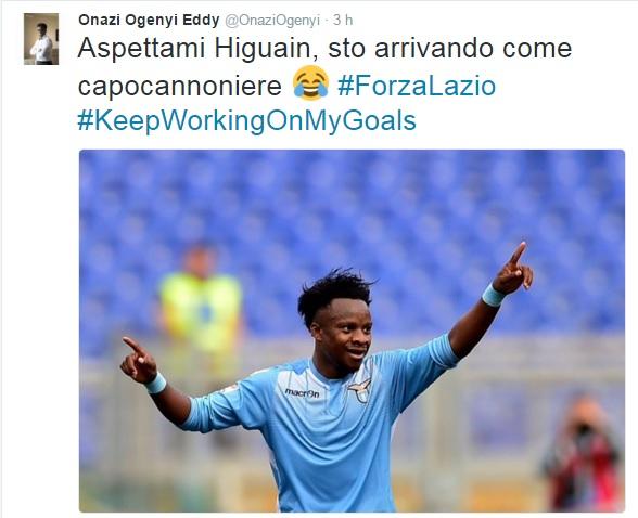Il centrocampista della Lazio ha infatti siglato ieri la prima rete stagionale in questo campionato, nel 2-0 che i biancocelesti hanno rifilato all’Empoli. Il nigeriano ha così deciso di “festeggiare” il lieto evento lanciando una sfida su Twitter al Pipita: “Aspettami Higuain, sto arrivando come capocannoniere 😂 #ForzaLazio #KeepWorkingOnMyGoals“.