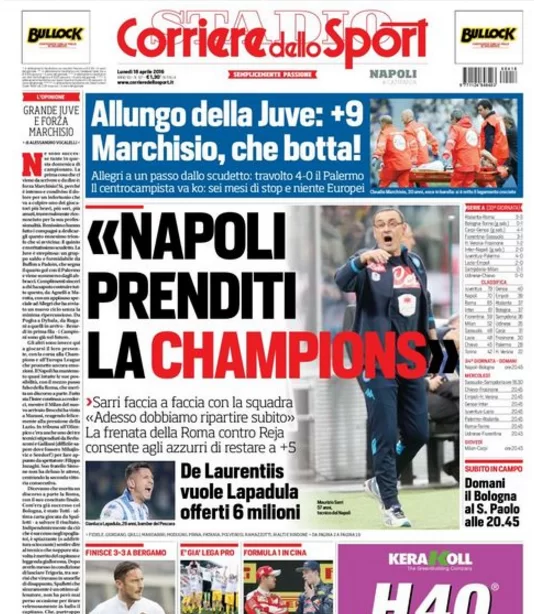 Il passo falso della Roma a Bergamo contro l’Atalanta (3-3) ridimensiona la sconfitta del Napoli patita ai danni dell’Inter. Restano dunque 5 punti di vantaggio dai giallorossi, con lo scudetto che sembra ormai in pieno controllo della Juventus che continua a macinare vittorie su vittorie. I maggiori quotidiani sportivi di oggi si dividono tra la lite Spalletti-Totti, l’importanza della Champions League per il Napoli, e l’infortunio di Marchisio. Queste tutte le prime pagine: