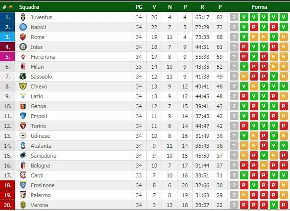 Vince ancora la Juventus che torna a +9 sul Napoli e si avvia a vincere lo Scudetto, netta la vittoria ai danni della Lazio per 3-0 nonostante il primo gol di Pogba fosse viziato da fallo. Clamoroso invece all’Olimpico dove la Roma, in svantaggio per 1-2 con il Torino, ha ribaltato la partita negli ultimi 5 minuti con una doppietta di Francesco Totti.
