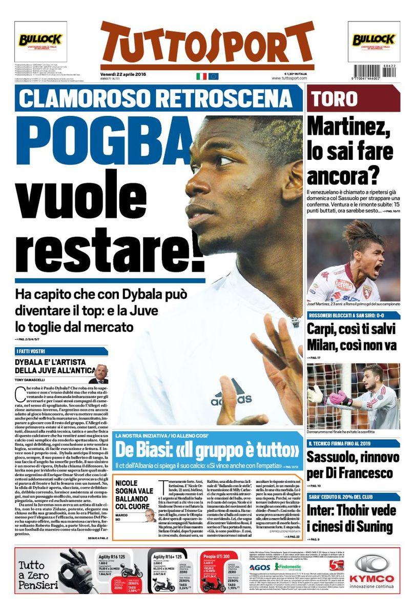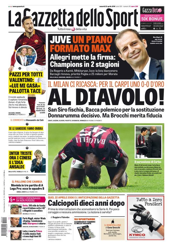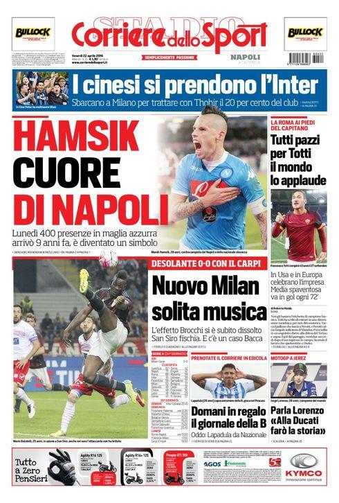 Le prime pagine dei quotidiani sportivi nazionali si soffermano sul posticipo, terminato 0-0, tra Milan e Carpi che ha chiuso la 34esima giornata di Serie A. Il Corriere dello Sport evidenzia anche come, con la presenza nella prossima partita contro la Roma, Marek Hamsik arrivi a festeggiare le 400 presenze con la maglia del Napoli; innalzandosi sempre più a simbolo della squadra azzurra.