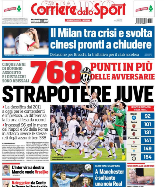 La lotta per gli ultimi due posti validi per la Champions League terrà banco per le restanti tre giornate di campionato. Il Napoli, nonostante la sconfitta di Roma, mantiene un vantaggio di due punti proprio sui giallorossi. La Roma, d’altro canto, vuole sfruttare l’ondata di ottimismo dovuta al successo in casa contro i partenopei. La Juventus invece continua i suoi festeggiamenti per il quinto tricolore consecutivo. Queste le prime pagine:
