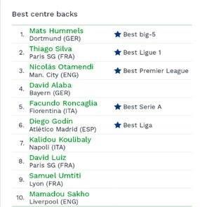 la classifica in questione tiene in considerazione i migliori 10 difensori dei campionati maggiori e anche la Serie A è presente con 2 esponenti. Ciò che farà probabilmente discutere è il nome del centrale più forte della Serie A, inoltre c’è da dire che non sono presenti difensori della Juve (SCORRI IN ALTO LA CLASSIFICA DEI MIGLIORI DIFENSORI).